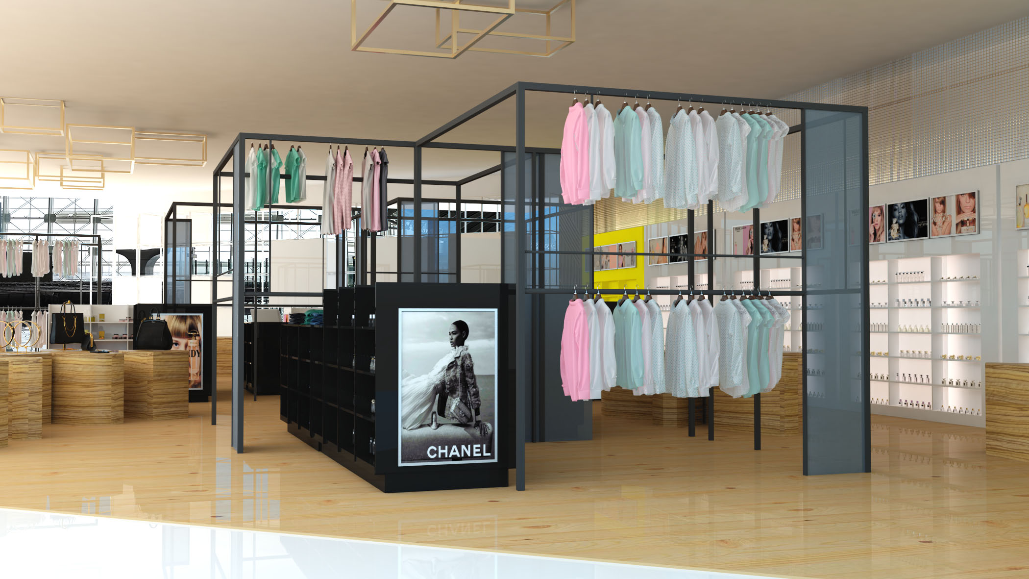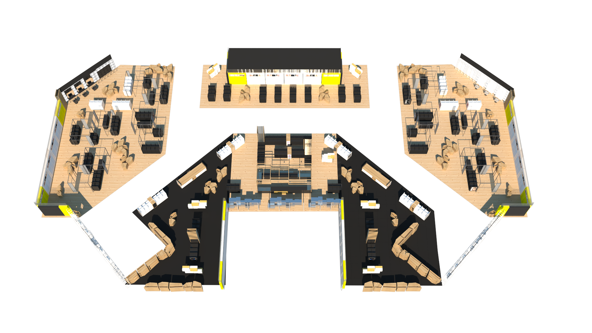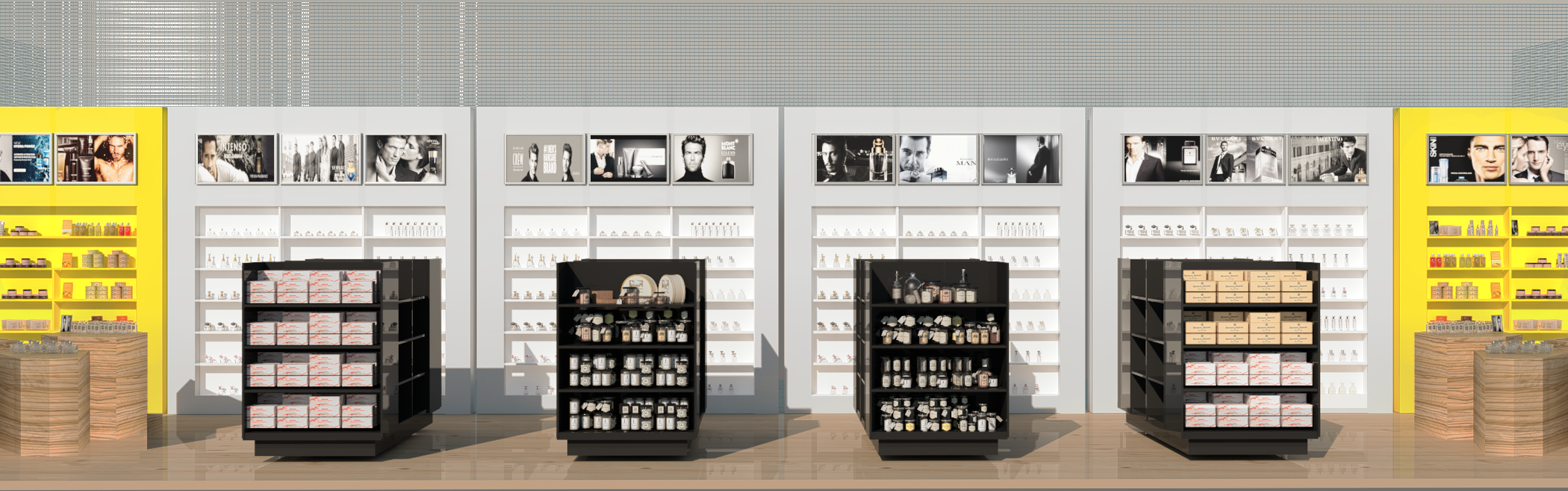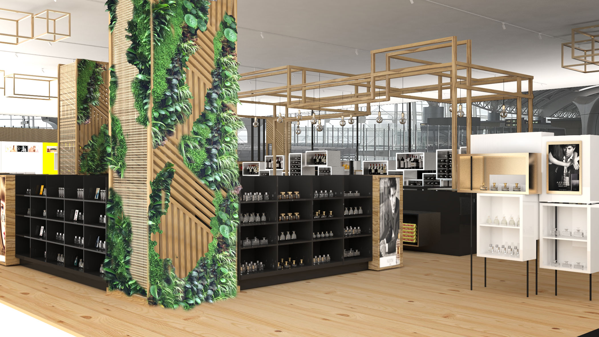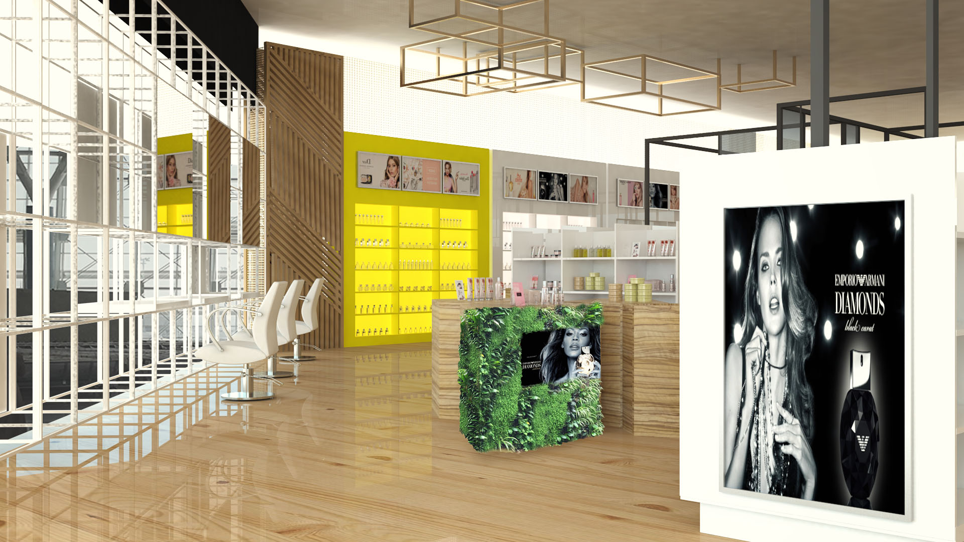 Exteriorul va folosi textura lemnului de măslin și bannere publicitare. Interiorul combină pereți verzi și lemn de măslin pentru a evoca Africa sălbatică, alături de pardoseală din lemn vechi și epoxidică neagră. Gondolele sunt din MDF alb lucios, asigurând o prezentare clară a produselor.