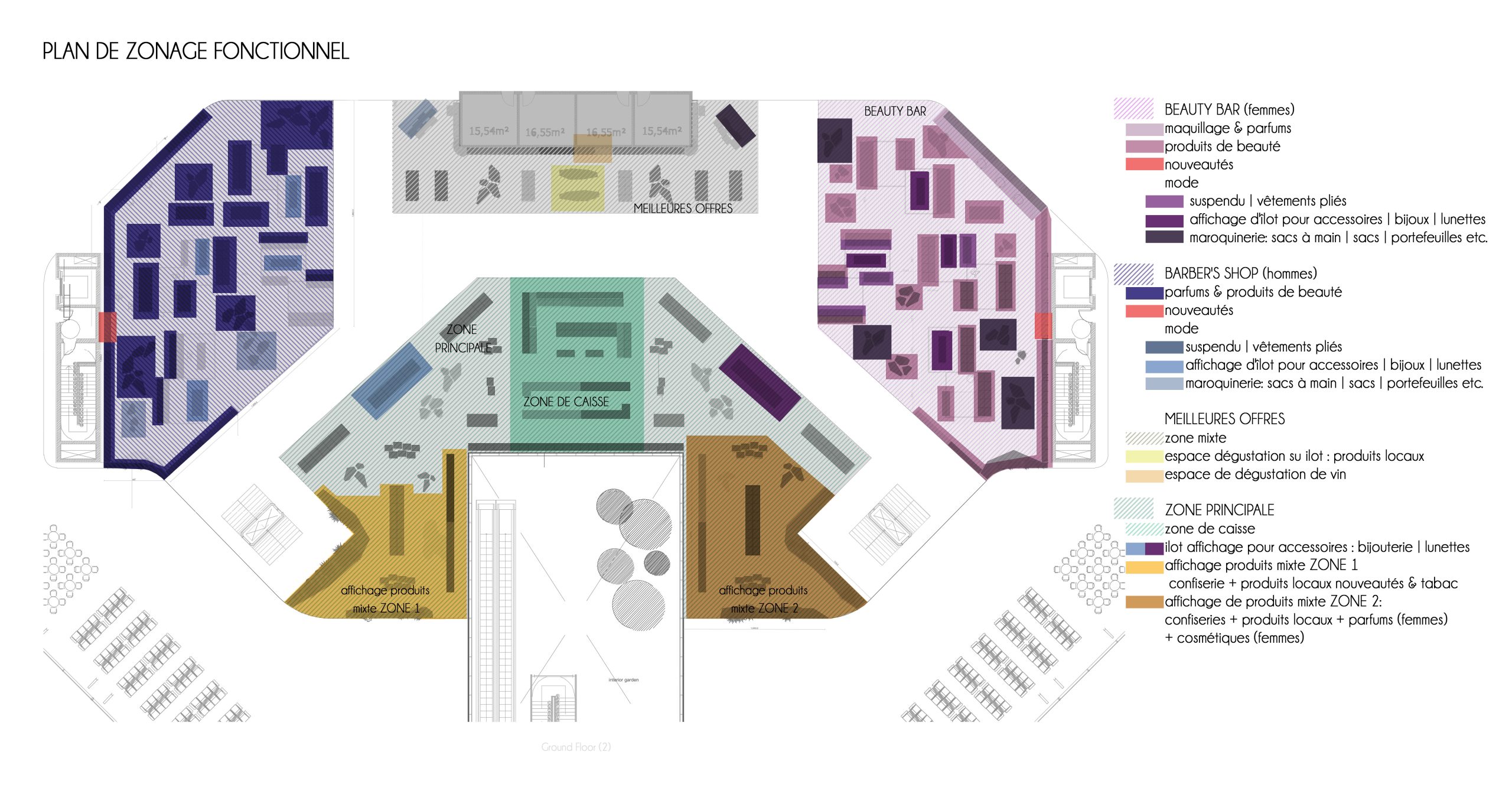 Layout-ul magazinului este eficient, menținând circulațiile principale și creând zone de cumpărare clar definite, pentru un flux pietonal ordonat și o expunere optimă a produselor.